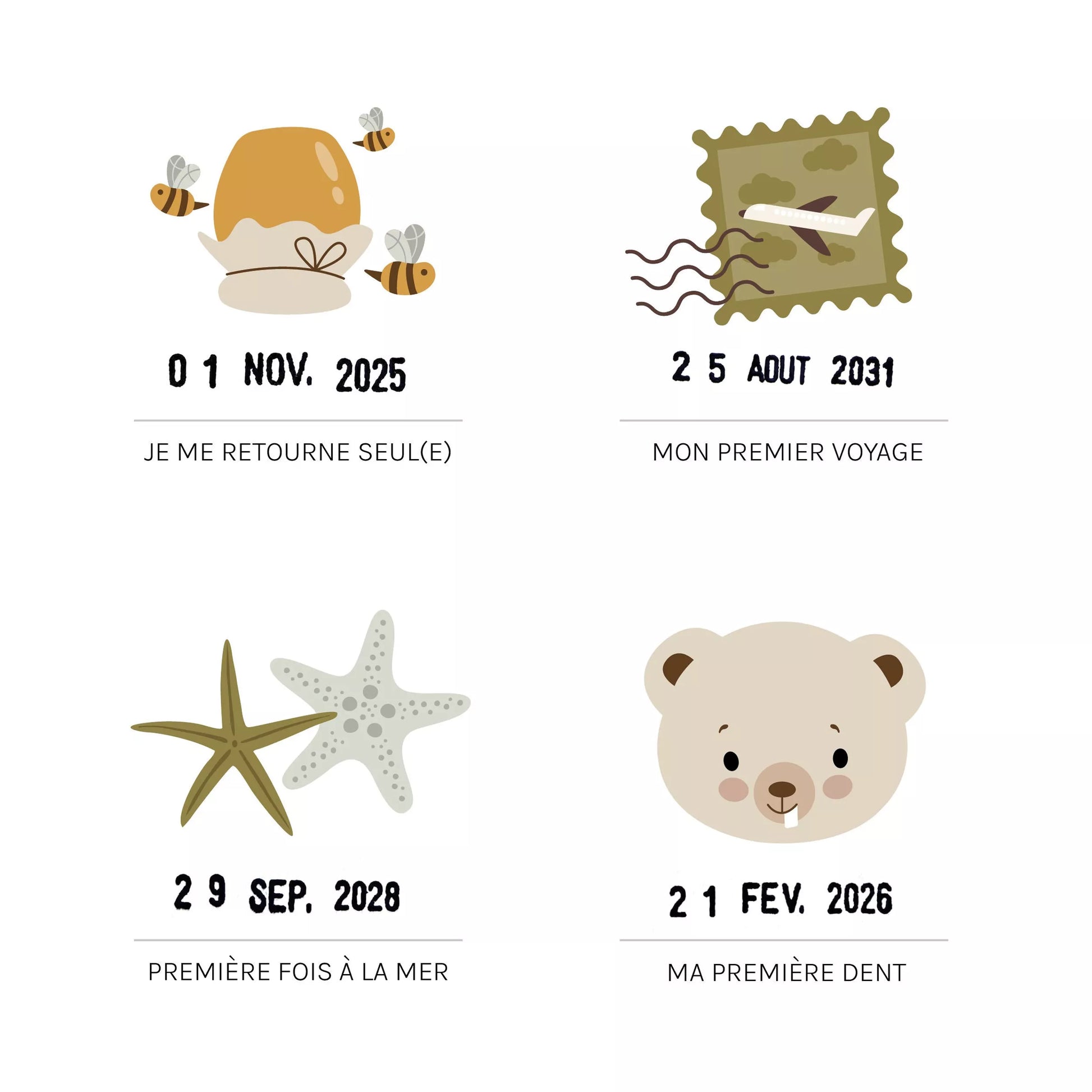 Souvenez-vous des petits moments qui comptent avec cette affiche des premières fois de bébé, et son tampon dateur. Cette jolie thématique ourson présente sublimes illustrations "ourson" teintées d'enfance, de douceur, de poésie qui conviennent autant aux chambres des petits garçons qu'à celles des petites filles.