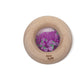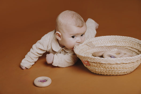 Il s'agit d'un hochet en bois en forme de beignet, idéal pour que les mains puissent le manipuler confortablement. À l'intérieur, on retrouve des formes de fruits et de légumes qui, lorsqu'on les secoue, émettent le son irrésistible qui est la marque de fabrique de Petit Boum.