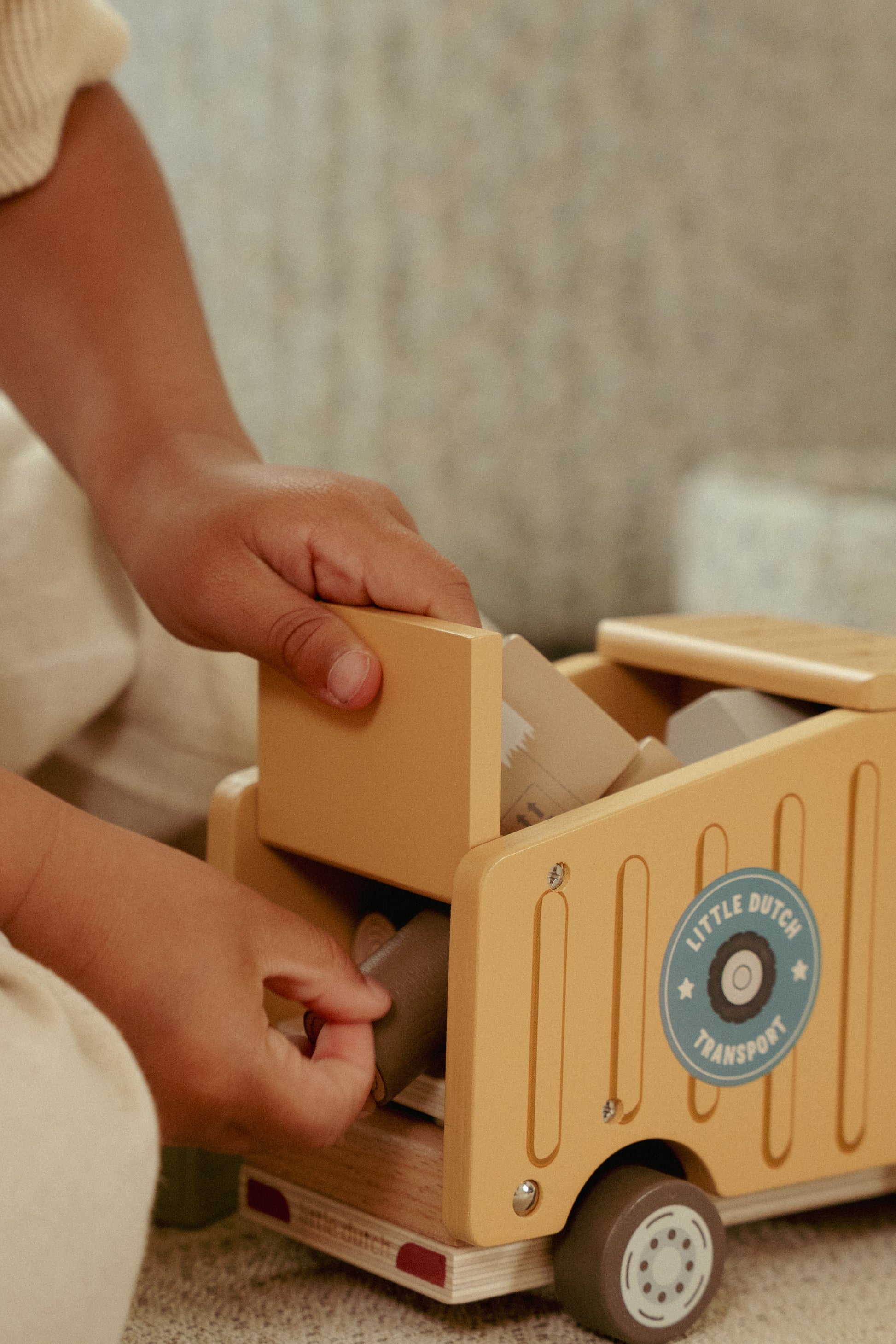 Ce camion benne en bois a une benne fonctionnelle et est livré avec deux chauffeurs de camion. Inclus divers chargements tels que des rondins, des pierres et des caisses en bois. Conduisez jusqu'au chantier, inclinez la benne et déversez la cargaison. Ce camion en bois s'accorde parfaitement avec les autres véhicules de construction.