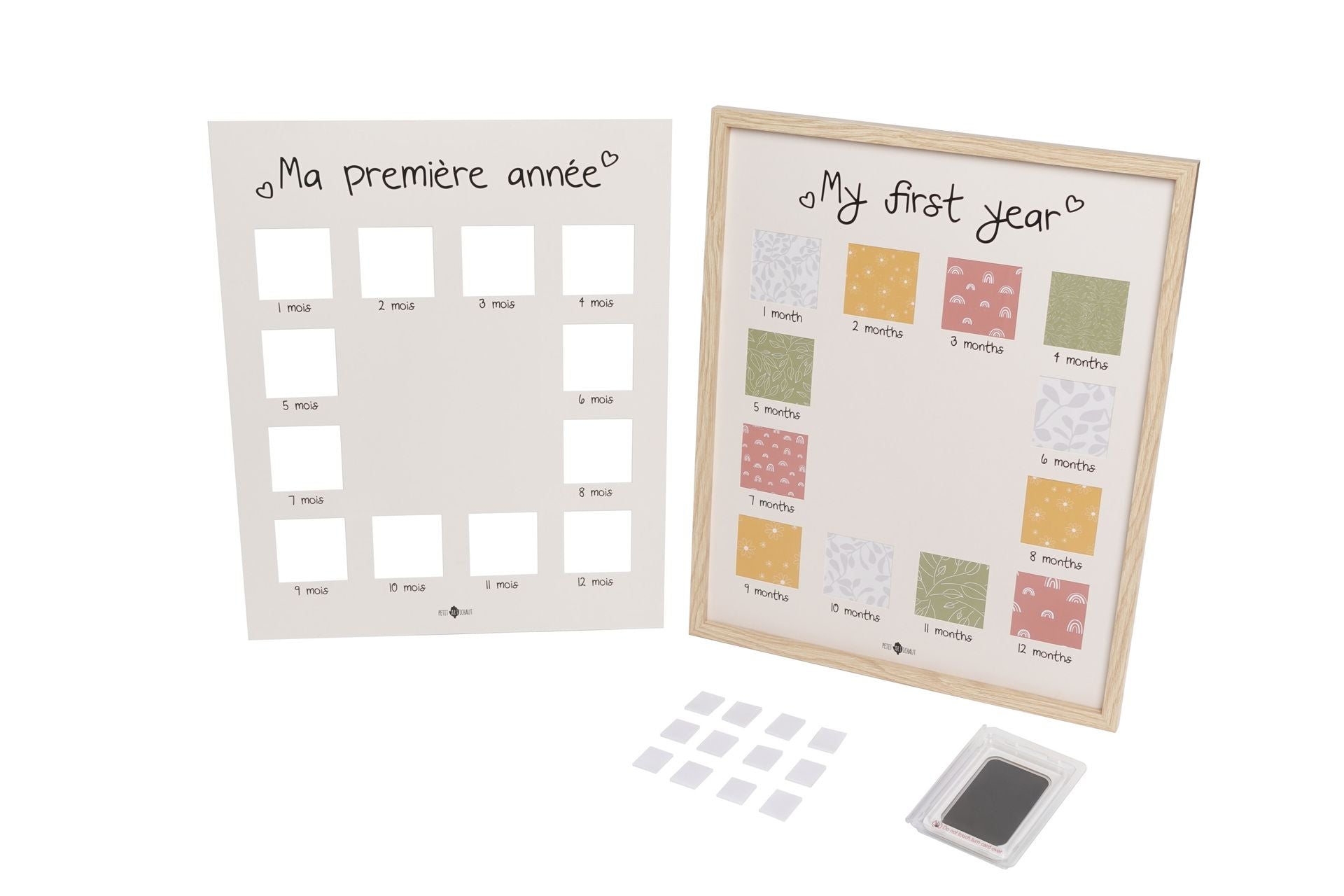 Le cadre "Ma Première Année" est recto verso (anglais/français) et son fond est décoré de doux motifs, donnant une touche design en attendant les photos des mois à venir.