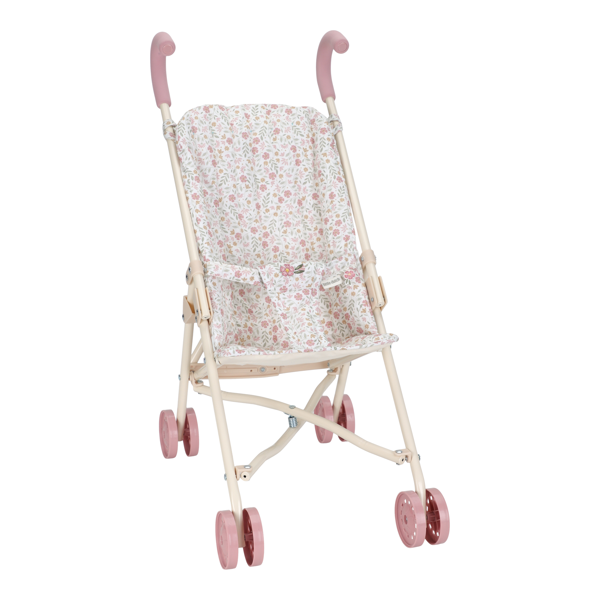 La poussette de poupée en métal avec châssis crème, poignées roses et 4 roues roses est conçue pour favoriser le jeu imaginatif et nourrir un sentiment de responsabilité chez les soignantes en herbe. La poussette est facile à replier, pour un rangement rapide.